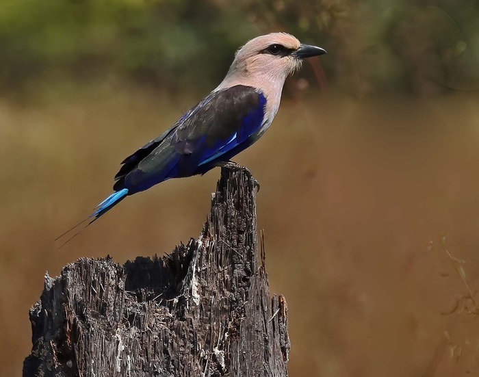 This is a common bird of warm open country with some trees. These rollers often perch prominently on trees, posts, or overhead wires, like giant shrikes, whilst watching for the grasshoppers and other large insects on which they feed.