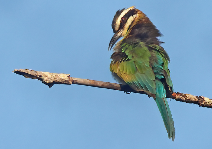 Dextrous and elegant in flight, White Throated Bee Eaters breed in semi- desert habitats on the Southern edge of the Sahara and migrate to Equatorial Africa in the winter. Their diet consists typically of bees, wasps and hornets, they nest communally with both parents feeding the young with help also provided by non-breeding adults.